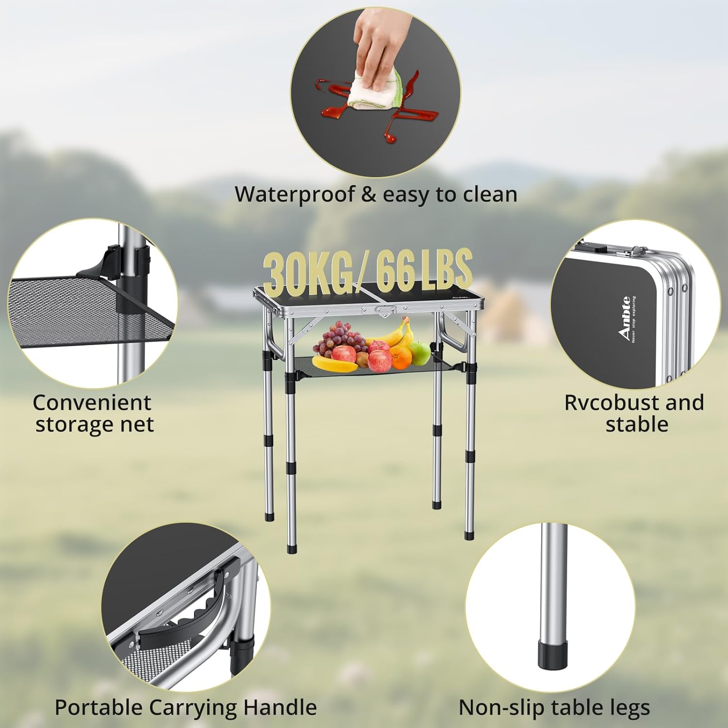 Folding Camping Table, Aluminum 24" x 16" Adjustable Height Small Folding Table with Carrying Handle, Lightweight, Portable Camping Table Waterproof for Outdoor Indoor Picnic Beach BBQ (Black)