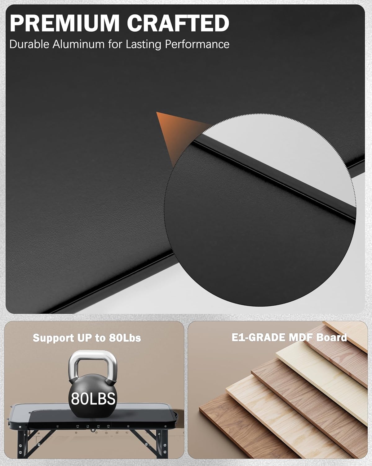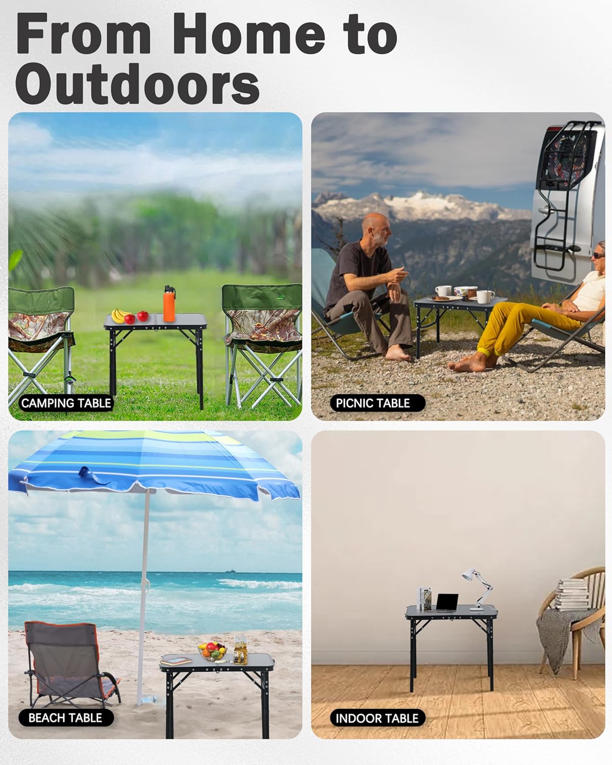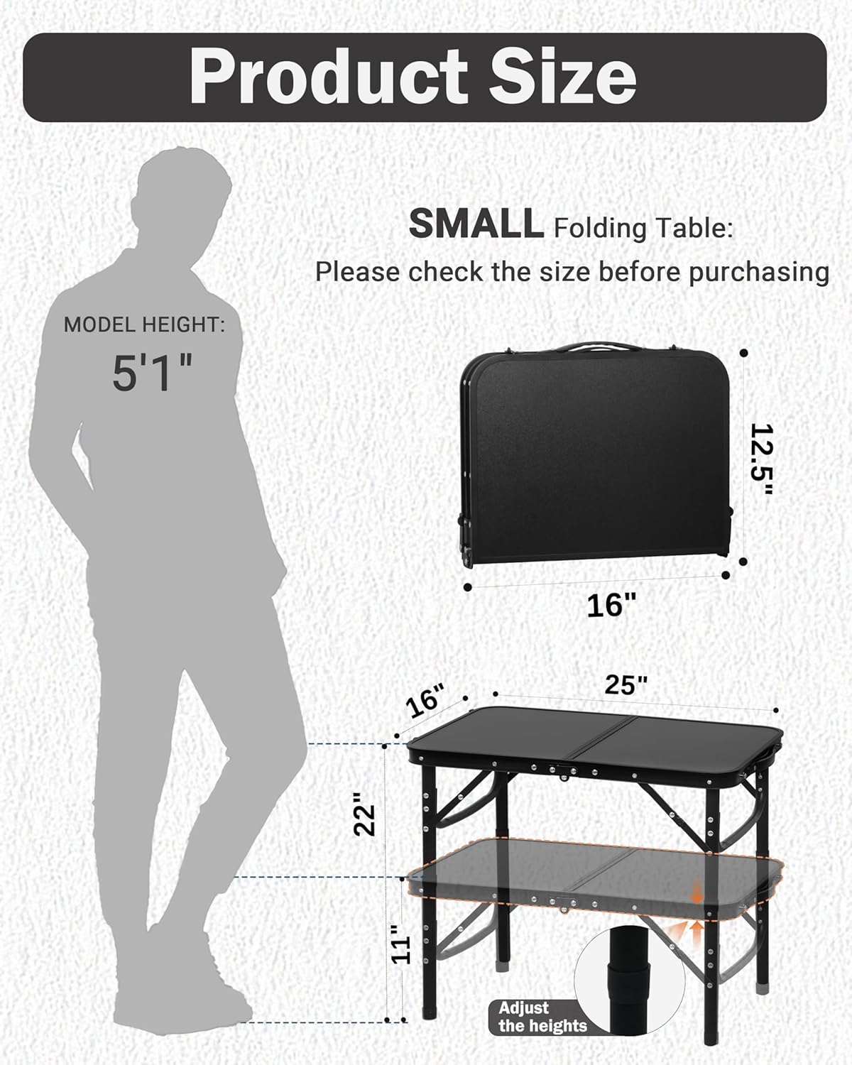 LOFTEY 2024 Reinforced Small Folding Table Portable, Small Foldable Camping Table, Heavy-Duty Mini Folding | Adjustable Height | Lightweight Premium Aluminum with Handle | Black 25"x16"x22"