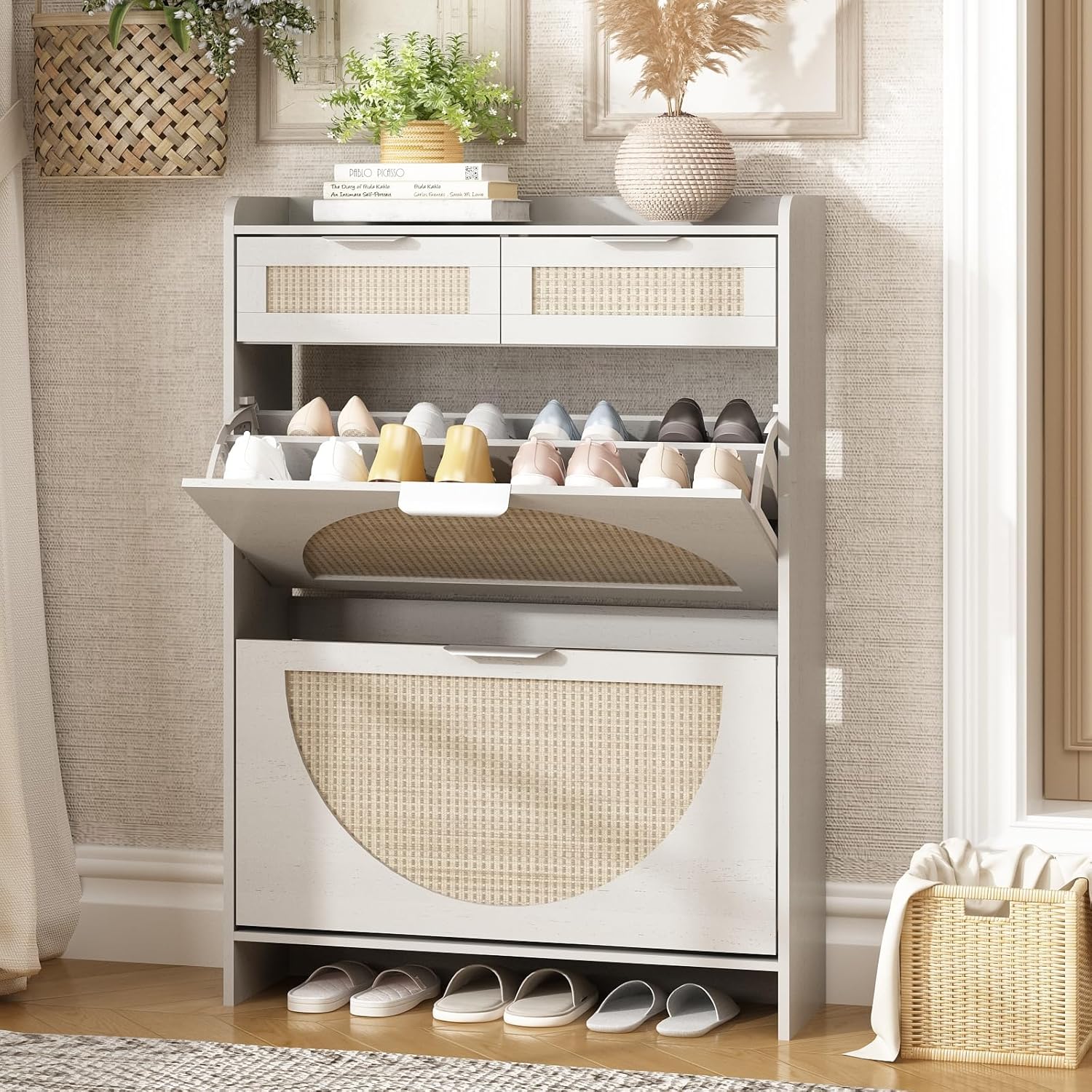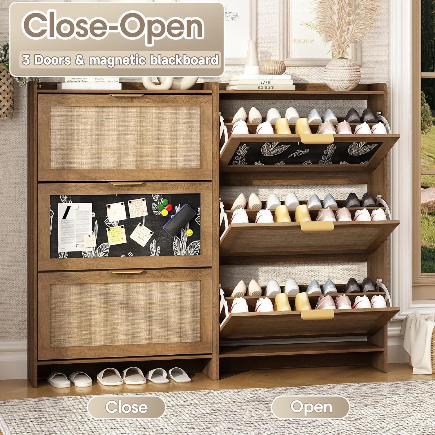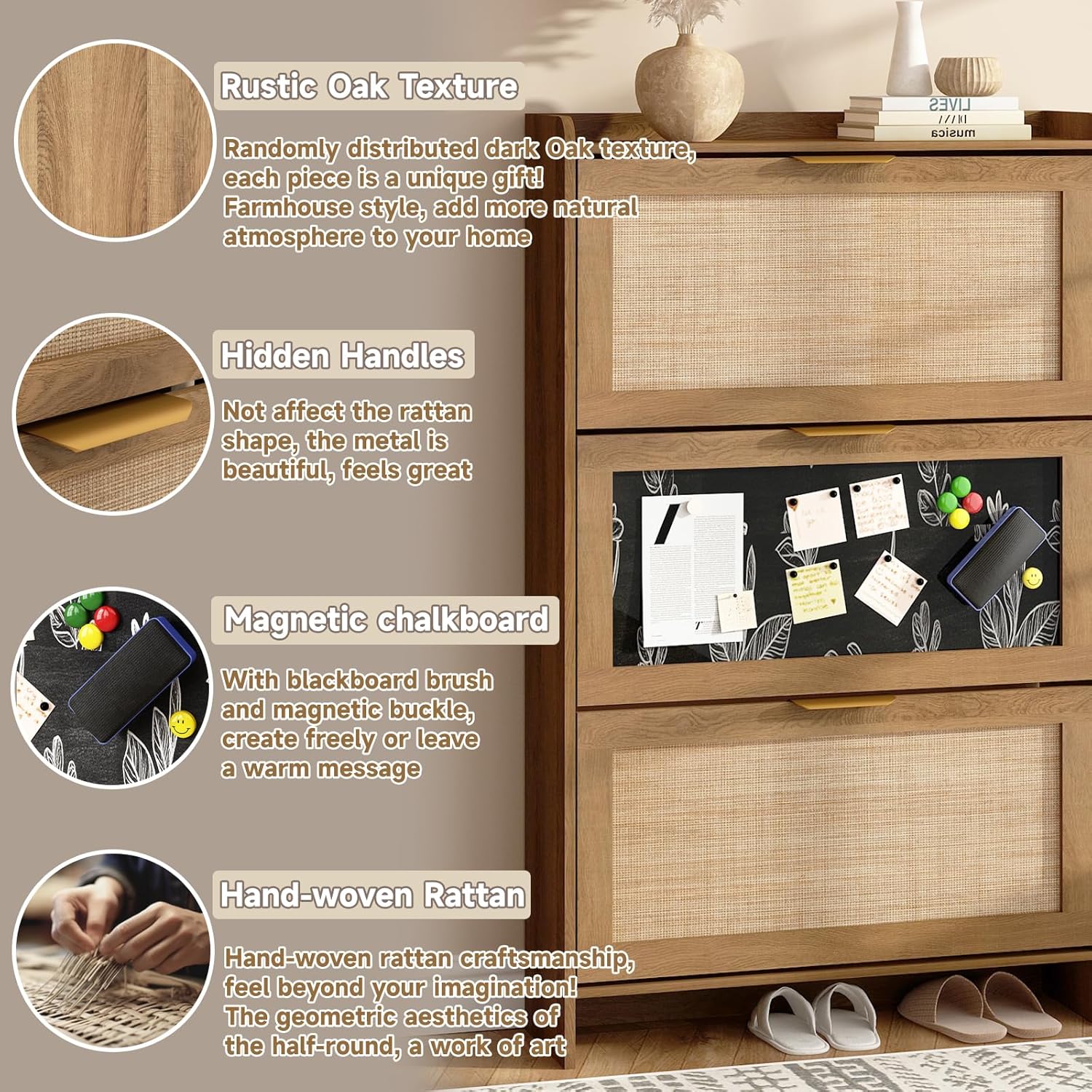 Rattan Shoe Storage Cabinet with 3 Flip Drawers & Chalkboard, Freestanding Organizer for Front Door Entrance, Hidden Narrow Shoe Rack Cabinet Storage for Entryway, Rustic Oak Rattan